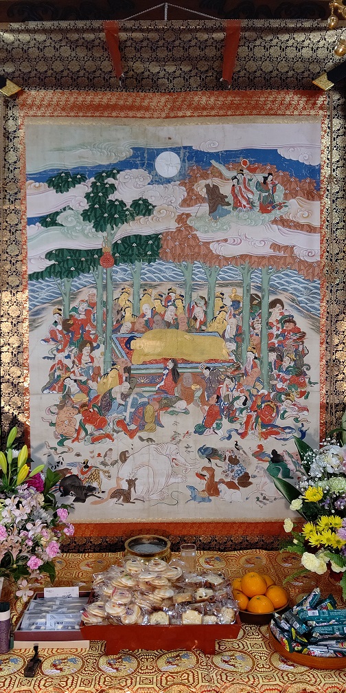 涅槃会(ねはんえ)とはお釈迦様の命日に、お釈迦様の遺徳を偲ぶ法要です。涅槃会ではお釈迦様の最期を描いた釈迦涅槃図を掲げて、遺教経(ゆいきょうぎょう)を読誦します。